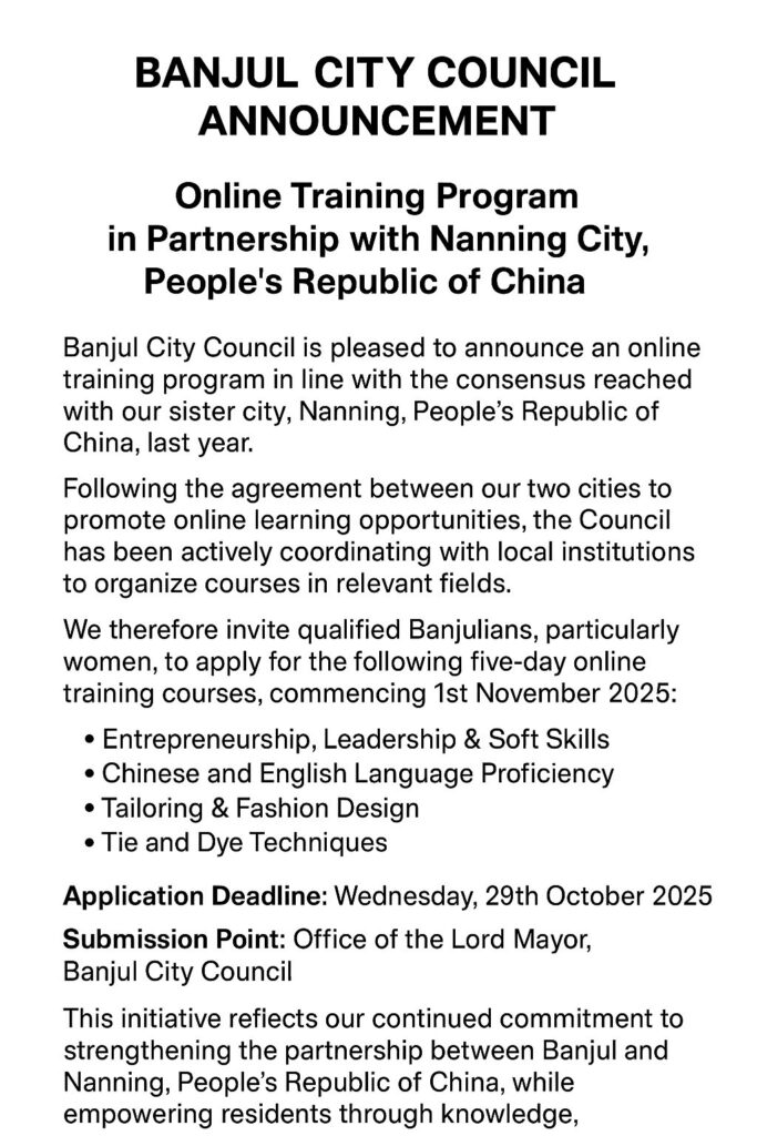๐๐ง๐ฅ๐ข๐ง๐ ๐๐ซ๐๐ข๐ง๐ข๐ง๐ ๐๐ซ๐จ๐ ๐ซ๐๐ฆ ๐ข๐ง ๐๐๐ซ๐ญ๐ง๐๐ซ๐ฌ๐ก๐ข๐ฉ ๐ฐ๐ข๐ญ๐ก ๐๐๐ง๐ง๐ข๐ง๐ ๐๐ข๐ญ๐ฒ, ๐๐๐จ๐ฉ๐ฅ๐โ๐ฌ ๐๐๐ฉ๐ฎ๐๐ฅ๐ข๐ ๐จ๐ ๐๐ก๐ข๐ง๐ Banjul City Council is thrilled to announce an online training program in line with the consensus reached with our sister city, Nanning, Peopleโs Republic of China, last year. Following the agreement between our two cities to promote online learning opportunities, we have been […]