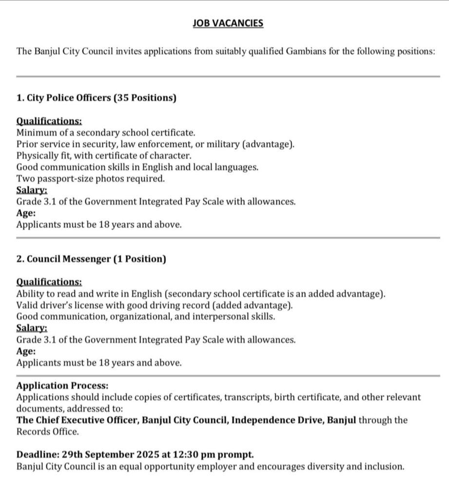 The Banjul City Council invites applications from suitably qualified Gambians for the following positions: ๐Ÿ. ๐‚๐ข๐ญ๐ฒ ๐๐จ๐ฅ๐ข๐œ๐ž ๐Ž๐Ÿ๐Ÿ๐ข๐œ๐ž๐ซ๐ฌ (๐Ÿ‘๐Ÿ“ ๐๐จ๐ฌ๐ข๐ญ๐ข๐จ๐ง๐ฌ) โ€ข Minimum of a secondary school certificate. โ€ข Physically fit, with certificate of character. โ€ข Prior service in security, law enforcement, or military (advantage). โ€ข Salary: Grade 3.1 of the Government Integrated Pay Scale with